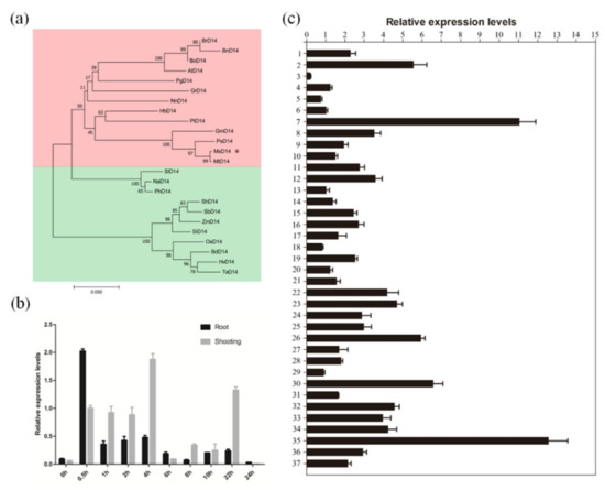 In addition, we measured the relative expression levels of MsD14 in response to strigolactone, as D14 is a strigolactone receptor gene. The results showed that MsD14 significantly responded to strigolactone in alfalfa seedlings (Figure 1b). Interestingly, the expression of MsD14 was dramatically elevated in roots at 0.5 h and then sharply decreased, while the peak transcript levels in shoots occurred at 4 h, suggesting that the response of MsD14 in roots was more sensitive than that in shoots.