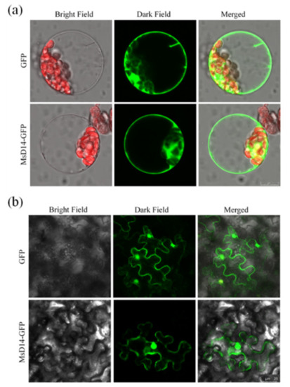 Previous studies have shown that both AtD14 and OsD14 were located in the nucleus and cytoplasm; therefore, we evaluated the subcellular localization of MsD14 in both Arabidopsis protoplast and tobacco (Nicotiana benthamiana) epidermal cells. To this end, we generated pJIT163::MsD14-GFP for the Arabidopsis protoplast transformation and pCAMBIA1302::MsD14-GFP for tobacco epidermal cells transformation. The results indicated that MsD14-GFP fusion protein fluorescence was targeted exclusively to the nucleus, cytoplasm, and cytomembrane in both Arabidopsis protoplast and tobacco epidermal cells, and control GFP fluorescence was observed in the entire cell (Figure 3).