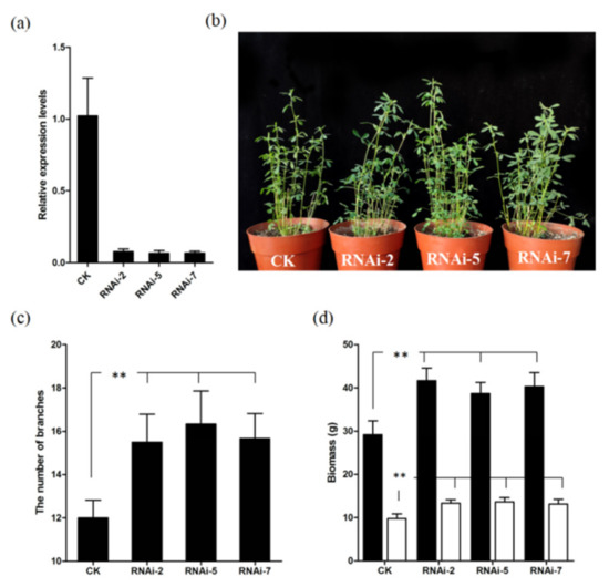 For further characterization, three transgenic lines (RNAi-2, RNAi-5, and RNAi-7) with more than 90% reduction of MsD14 expression levels were selected for detailed phenotypic assessment (Figure 4a). The results showed that the transgenic plants exhibited a 29.16–36.11% increase in branching number, which was significantly different from the results for the control plants (Figure 4b,c). Further studies on biomass indicated that the transgenic plants showed a 32.57–42.85% increase in fresh biomass and a 34.52–39.54% increase in dry biomass compared with the control plants (Figure 4d). These results strongly suggested that silencing MsD14 positively affected biomass by increasing the branching number in alfalfa.