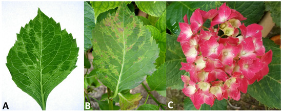 Viral diseases may have a significant impact on the appearance, health and market value of hydrangea, especially because it is propagated vegetatively and viruses are easily transmitted and accumulated over time through cuttings, causing a decline in the crop. Moreover, in recent years, emerging viral diseases in hydrangea with the capacity to cause more serious yield losses have been described; thus, in addition to phytoplasma diseases, they are considered a serious developing threat to hydrangea [3]. In total, fourteen viruses have been found to infect hydrangeas [4].