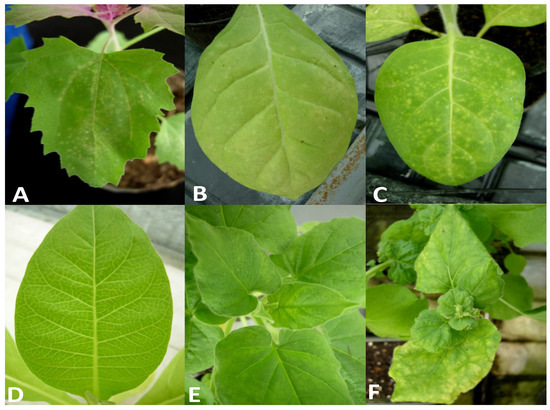 Symptoms induced by HdVBV in some herbaceous hosts: (A) pinpoint chlorotic local lesion in C. amaranticolor; (B) some chlorotic local lesions in N. tabacum; (C) chlorotic local lesions in N. rustica; (D) vein clearing in N. tabacum; (E) mosaic in N. glutinosa; (F) yellowing and distortion of the apical leaves in N. benthamiana.