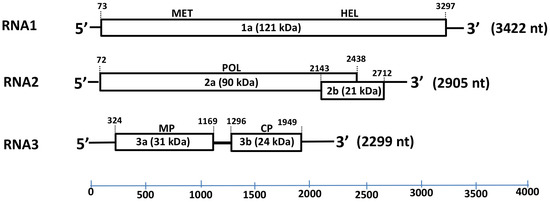 Schematic representation of the hydrangea vein banding virus genome. The expression product of each RNA sequence is presented as rectangular box, whereas lines depict untranslated genomic regions (UTRs). The length of each RNA segment along with the estimated molecular mass (kDa) and function of each putative protein (1a, 2a, 3a and 3b) are indicated. Abbreviations: MET—methyltransferase; HEL—helicase; POL—RNA-dependent RNA polymerase (RdRp); MP—movement protein; CP—coat protein.