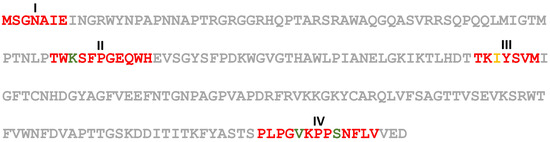 The amino acid sequence of the hydrangea vein banding virus (HdVBV) coat protein. I–IV, conserved amino acid motifs within subgroup 2: red fonts indicate the AAs shared by all ilarviruses within subgroup 2; green fonts identify the variable residues; orange font shows an unexpected residue in the HdVBV coat protein. In addition, motif III has a missing tryptophan residue (W), since the aa sequence shared by all members of subgroup 2 is TKVYSWVM [10].