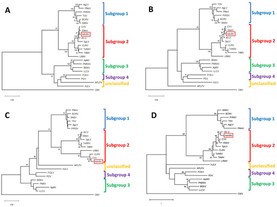 Phylogenetic relationships of hydrangea vein banding virus (HdVBV; GenBank accession nos. OK666835-OK666837) and officially recognized species in the genus Ilarvirus based on the alignment of the complete amino acid sequences of p1 (A), p2 (B), p3a (C) and p3b (D). Phylogenetic analysis was performed using the maximum likelihood method in MEGA X with 1000 bootstrap replicates based on LG+G (for p1, p2 and p3a) and WAG+G (for p3b) substitution models [11,12]. Bootstrap values >70% at each node are shown. The position of HdVBV within the trees is highlighted with a red box. cucumber mosaic virus (CMV, genus Cucumovirus; RNA1: NC_002034; RNA2: NC_002035; RNA3: NC_001440) was used as an outgroup. Viruses and their relative reference sequences used for tree reconstruction are: ageratum latent virus (AgLV, RNA1: NC_022127; RNA2: NC_022128; RNA3: NC_022129), American plum line pattern virus (APLPV, RNA1: NC_003451; RNA2: NC_003452; RNA3: NC_003453), apple mosaic virus (ApMV, RNA1: NC_003464; RNA2: NC_003465; RNA3: NC_003480), asparagus virus 2 (AV-2, RNA1: NC_011808; RNA2: NC_011809; RNA3: NC_011807), blackberry chlorotic ringspot virus (BCRV, RNA1: NC_011553; RNA2: NC_011554; RNA3: NC_011555), blueberry shock virus (BlShV, RNA1: NC_022250; RNA2: NC_022251; RNA3: NC_022252), citrus leaf rugose virus (CLRV, RNA1: NC_003548; RNA2: NC_003547; RNA3: NC_003546), citrus variegation virus (CVV, RNA1: NC_009537; RNA2: NC_009538; RNA2: NC_009536), elm mottle virus (EMoV, RNA1: NC_003569; RNA2: NC_003568; RNA3: NC003570), fragaria chiloensis latent virus (FCILV, RNA1: NC_006566; RNA2: NC_006567; RNA3: NC_006568), humulus japonicus latent virus (HJLV, RNA1: NC_006064; RNA2: NC_006065; RNA3: NC_006066), lilac leaf chlorosis virus (LLCV, RNA1: NC_025477; RNA2: NC_025478; RNA3: NC_025481), lilac ring mottle virus (LRMV, RNA1: EU919668, partial sequence; RNA2: NC_038777; RNA3: 038776), parietaria mottle virus (PMoV, RNA1: NC_005848; RNA2: NC_005849; RNA3: NC_005854), privet ring spot virus (PrRSV, RNA1:NC_027928; RNA2: NC_027929; RNA3: NC_027930), prune dwarf virus (PDV, RNA1: NC_008039; RNA2: NC_008037; RNA3: NC_008038), prunus necrotic ringspot virus (PNRV, RNA1: NC_004362; RNA2: NC_004363; RNA3: NC_004364), spinach latent virus (SpLV, RNA1: NC_003808; RNA2: NC_003809; NC: 003810), strawberry necrotic shock virus (SNSV, RNA1: NC_008708; RNA2: NC_008707; RNA3: NC_008706), tobacco streak virus (TSV, RNA1: NC_003844; RNA2: NC_003842; RNA3: NC_003845), tomato necrotic streak virus (ToNSV, RNA1: NC_039074; RNA2: NC_039075; RNA3: NC_039076) and Tulare apple mosaic virus (TAMV, RNA1: NC_003833; RNA2: NC_003834; RNA3: NC_003835).