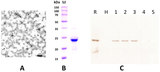 The partial purified virus preparations contained quasi-isometric particles with a mean diameter of 30 nm and some heterogeneity in size, as is typically reported for ilarviruses (Figure 6A) [5]. From the His-tagged CP soluble fraction that was recovered from E. coli transformed with pET-30a-CP, only a protein band with a molecular mass of 24 kD was clearly visible in 12.5% SDS-PAGE after purification using a Ni-NTA agarose column and dialysis in 145 mM NaCl solution (Figure 6B). This preparation was used to elicit polyclonal antiserum in a rabbit (cfr. Section 4). The serum had a titer of 1:128 in a double diffusion test (not shown) and was used at a 1:1000 dilution for Western blotting. The antibody produced did not react to the extract of healthy plants nor to that of plants infected with SpLV or AV-2 but did exhibit a clear specific reaction to extracts from an HdVBV-diseased plant and to the recombinant protein (Figure 6C).