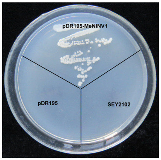Previously, 11 A/N-Inv family genes (MeNINVs) from the cassava genome were cloned and analyzed in our laboratory [24]. MeNINV1 was classified into the α-group with relatively high expression levels in different tissues and stages of tuber root development. To verify whether MeNINV1 had A/N-Inv activity, the MeNINV1 gene was cloned into the yeast-expressing vector pDR195. The recombinant plasmid was named pDR195-MeNINV1 and transformed into the invertase mutant yeast strain SEY2102. SEY2102, SEY2102 carrying pDR195, and SEY2102 carrying pDR195-MeNINV1 were streaked on Synthetic Dropout solid medium (SD medium lacking uracil) with sucrose as the sole carbon source. The results showed that SEY2102 carrying the pDR195-MeNINV1 strain grew normally, while the other two yeast strains did not (Figure 1). This result indicated that MeNINV1 can catalyze the decomposition of sucrose to provide a carbon source and energy for the growth of the invertase mutant yeast SEY2102.