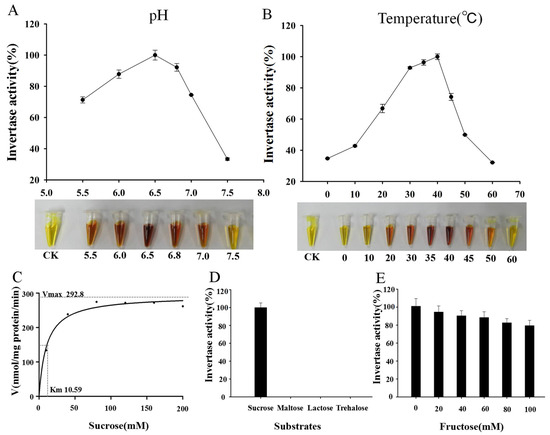 Yeast cells containing the pDR195 or pDR195-MeNINV1 vectors were cultured in a YPD solution medium for 2 d at 30 °C. The cells were collected by centrifugation at 12,000 rpm and 4 °C for 10 min and washed twice with PBS buffer. The collected yeast cells were ground using liquid nitrogen and then transferred to PBS buffer (pH = 6.5) and centrifuged at 12,000 rpm at 4 °C for 10 min. The supernatant was a crude enzyme solution. The concentration of the extracted protein was determined by the Bradford method [43]. Alkaline/neutral invertase activity was measured using the DNS method [44], the activity using crude serum from SEY2102 carrying pDR195 as essential control. To determine the optimal reaction conditions, different pH values, temperatures, and sucrose concentrations were tested. Under the optimal conditions, the effects of different substrates, fructose concentrations, metal ions (Ca2+, Mg2+, Mn2+, Zn2+, and Pd2+), and chemical reagents (Tris, EDTA, DTT, and VB6) on the enzyme activity were studied.