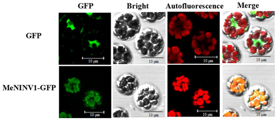 Subcellular localization of MeNINV1 in cassava mesophyll protoplasts. GFP fluorescence was observed using the green channel, and chlorophyll autofluorescence was visualized using the red channel. Bar = 10 μm.