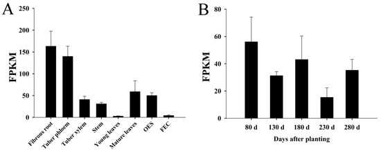 Expression analysis of the MeNINV1 gene in cassava tissues and organs and during tuber root development. (A) Tissue and organ expression analysis of the MeNINV1 gene. (B) Expression analysis of the MeNINV1 gene during tuber root development. Data are the mean ± SD of three independent assays. FPKM—Fragments per kilobase per exon model per million mapped fragments.