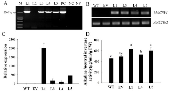 Identification of MeNINV1 transgenic Arabidopsis lines. (A) PCR detection of T1 transgenic Arabidopsis, M—DL2000 marker; L1–5—transgenic plants; PC—positive control of pCAMBIA1300-MeNINV1-GFP vector; NC—negative control of WT; NP—no template PCR. (B) Semiquantitative RT–PCR of MeNINV1 in T1 transgenic Arabidopsis lines. AtACTIN2 was the reference gene. (C) The related expression levels of MeNINV1 in T1 transgenic Arabidopsis lines. AtACTIN2 was the reference gene, and the relative expression of MeNINV1 in WT was used as a calibrator to compare with other lines for mapmaking. (D) A/N-Inv activity in leaves of WT and transgenic Arabidopsis. In (B–D): WT—wild-type Arabidopsis thaliana Columbia; EV—transgenic Arabidopsis with the pCAMBIA1300-GFP vector. Data in (C,D) are the mean ± SD of three independent assays. Significant differences were determined by one-way ANOVA followed by Duncan’s multiple range test at p < 0.05. Values labeled with different letters (a, b, and c) were significantly different.