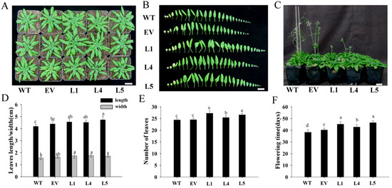 The MeNINV1 homozygous lines L1, L4, and L5, EV transgenic Arabidopsis; and WT Arabidopsis were cultured under the same conditions (Figure 6A). The leaf morphologies of MeNINV1 transgenic Arabidopsis were not significantly different from those of EV and WT (Figure 6B). Still, the leaf length and width were significantly larger than WT (Figure 6D). The numbers of leaves per plant were also significantly greater than those of EV and WT (Figure 6E). The flowering time of MeNINV1 transgenic Arabidopsis was significantly later than that of EV and WT, which was delayed by 3 to 6 d (Figure 6C,F). However, there were no significant differences in the morphologies of the flowers, pods, and seeds among the MeNINV1 transgenic Arabidopsis and EV and WT (Figure S2). These results indicate that the MeNINV1 gene promotes the growth of Arabidopsis and delays plant flowering.