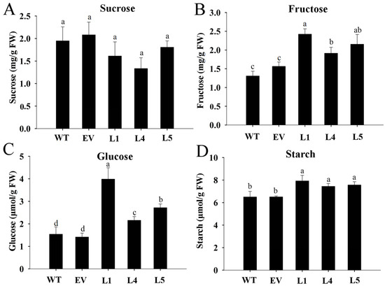 Analysis of sucrose, fructose, glucose, and starch in MeNINV1 transgenic Arabidopsis and their controls. (A) Sucrose content. (B) Fructose content. (C) Glucose content. (D) Starch content. The plants used for analysis were six weeks old. L1, L4, and L5 are MeNINV1 transgenic Arabidopsis lines. EV is a pCAMBIA1300-GFP transgenic Arabidopsis line. WT is wild-type Arabidopsis. Data are the mean ± SD of three independent assays. Significant differences were determined by one-way ANOVA followed by Duncan’s multiple range test at p < 0.05. Values labeled with different letters (a, b, and c) were significantly different.