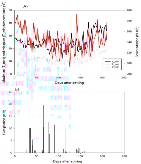 Daily minimum and maximum temperatures, as well as solar radiation (A) and precipitation (B), at the experimental site.