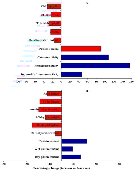 Percentage change (increase or decrease) in physiological and biochemical traits (A) and agronomic and grain quality traits (B) exposed to drought stress compared with well-watered wheat plants.