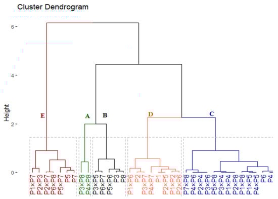 The hierarchical cluster classified the 36 evaluated genotypes into 5 groups according to their drought tolerance (Figure 5). Group (A) included two genotypes (P3 × P8 and P4 × P8) that possessed the highest tolerance indices (Table S3); accordingly, they are considered highly drought-tolerant genotypes. The group (B) comprised of four genotypes (P3, P8, P3 × P5, P6 × P7, and P5 × P6) had high values; accordingly, they are deemed drought-tolerant genotypes. Similarly, group (C) consist of 14 genotypes with intermediate values of tolerance indices; hence, they are categorized as moderate drought-tolerant genotypes. Otherwise, eight genotypes in group (D) and seven genotypes in group (E) recorded the lowest values. Consequently, they are considered drought-sensitive and highly drought-sensitive genotypes, in the same order.