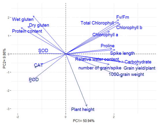 The first two principal components (PCAs) explained most of the variability, 60.80% (50.94% and 9.86% by PCA1 and PCA2). Hence, the two PCAs were utilized to construct the PC-biplot (Figure 6). Strong correlation was distinguished between grain yield and each of the following: chlorophyll a, chlorophyll b, total chlorophyll, Fv/Fm, RWC, proline content, plant height, spike length, 1000 grain weight, and number of grains per spike. In contrast, a negative association was detected between yield traits and each of the following: antioxidant enzyme activities (CAT, POD, and SOD), grain protein content, wet gluten content, and dry gluten content. Analogous results were deduced by the association heatmap as presented in Figure S5.