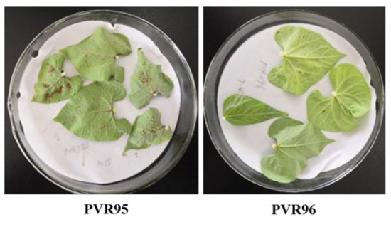 According to the reference genome annotation in Phaseolus vulgaris v2.1, the predicated genes residing in the QTL regions from QTL-Seq analysis were retrieved. The SNPs/InDels in exons between the parents PVR95 and PVR96 were analyzed and further grouped into synonymous, non-synonymous, frameshift or non-frameshift mutations according to their putative effects on peptide structure using ANNOVAR analysis (http://www.openbioinformatics.org/annovar/ accessed on 23 June 2021).