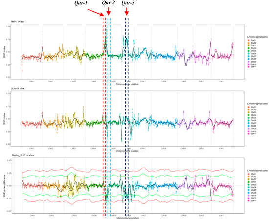 The SNP index for each identified SNP was calculated first for R bulk and S bulk, and then an average SNP index was calculated with a sliding window of a 1-Mb interval with a 10-kb increment. After calculating the SNP index, Δ(SNP-index) was calculated. By plotting the average SNP index of R bulk, S bulk and Δ(SNP-index) against the genome positions, three significant genomic regions were identified, which was designed as Qur-1, Qur-2 and Qur-3 (Figure 2). Qur-1 was located in a 1.81-Mb interval from 47,190,000 bp to 48,999,999 bp on chromosome 4; this region contained 65 SNPs with Δ(SNP-index) > 0.4 in the exon region of the candidate genes, and all these SNPs were nonsynonymous SNPs. Qur-2 was located in a 2.73-Mb interval from 1,900,000 bp to 4,629,999 bp on chromosome 5; this region contained 105 exonic SNPs with Δ(SNP-index) > 0.4, including 104 nonsynonymous SNPs and one stopgain SNP. Qur-3 was located in a 1.26-Mb interval from 15,080,000 bp to 16,339,999 bp on chromosome 6; this region contained 9 exonic SNPs with Δ(SNP-index) > 0.4, and all were nonsynonymous SNPs.