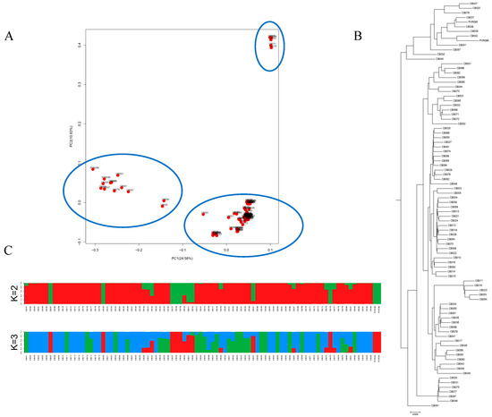 Population structure of the diversity panel. (A) PCA analysis calculated in the panel; (B) an unrooted neighbor-joining tree showing the dendrogram of all accessions; (C) estimated population structure of the panel inferred at K = 2 and K = 3.