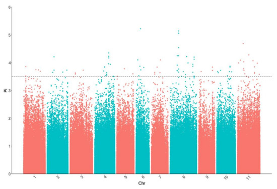 Manhattan plots for rust resistance in current study. Pi, −log10 (p-value).