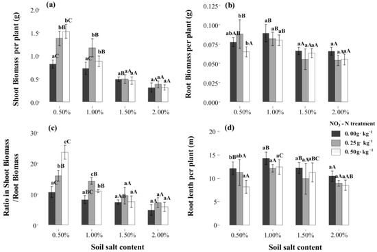 Effects of -N treatments on Suaeda salsa grown at different salt levels. (a) Shoot biomass, (b) root biomass, (c) shoot/root ratio, and (d) root length. Capital letters indicate significant differences among the four salt levels. Lowercase letters indicate significant differences among the three -N treatments.