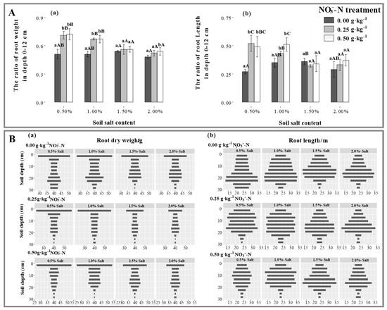 Effects of -N treatments on the root biomass and length distribution of Suaeda salsa grown at different salt levels. (A(a,b)) represents the ratio of root weight to length in depth 0–12 cm. (B(a,b)) represents the root biomass and length distribution. Capital letters indicate significant differences among the four salt levels. Lowercase letters indicate significant differences among the three N treatments.