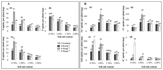 Effects of salt and -N on nutrient (A) and ion (B) uptake by the shoots of Suaeda salsa. (A(a–c)) represent the absorptions in nitrogen (N), phosphorus (P), and potassium (K), and (B(a–d)) represent the absorptions in , , salt, and . Capital letters indicate significant differences among the four salt levels. Lowercase letters indicate significant differences among the three—N treatments.