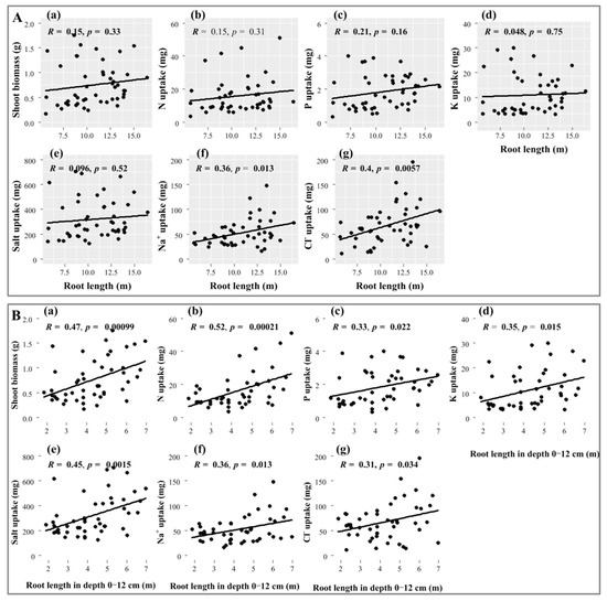 Relationships of total root length (A) and root length in depth 0–12 cm (B) with shoot biomass, nutrient, and ion uptakes of Suaeda salsa. (Aa,Ba), shoot biomass; (Ab,Bb), N uptake; (Ac,Bc), K uptake; (Ad,Bd), P uptake; (Ae,Be), salt uptake; (Af,Bf), uptake; (A,Bg), uptake.