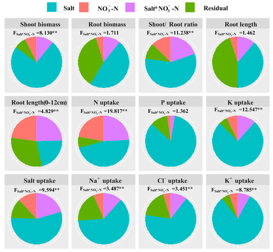 Results (F-value) of two-way ANOVA on the interactive effects of salt and N application on shoot and root biomass, root length and surface area, and ion and nutrient absorption of Suaeda salsa. The sector areas represent the ratios of the values in the sum of squares (SS: Salt, -N, Salt * -N and Residual) to total sum of square (SST). ** represented the significant level of 0.01.