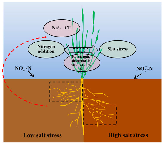 Diagram of the interactive effect between salt and -N on root growth and ion accumulation of Suaeda salsa. Dotted boxes represent the positive effect on root elongation in the different soil layer.