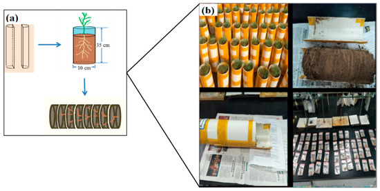Experimental device and root samples. (a) Experimental setup. (b) Experimental procedure from seeding to root collection.