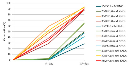 Figure 1 displays cumulative germination data for all combinations of incubation temperature and nitrate concentration under light conditions. As can be seen, the germination dynamic was similar at 15/6 °C and 20/10 °C on the fourth day and germination was neglectable. However, final germination was higher at 20/10 °C (49.49–65.21%) compared to 15/6 °C (28.46–47.35%). At elevated temperatures (30/15 °C and 35/20 °C), germination was higher compared to other temperature regimes, with germination on the fourth day ranging between 28.7 and 59.4%. After that, a similar germination dynamic can be seen since the percentage of final germinated seeds was around 90% in those elevated temperature regimes.