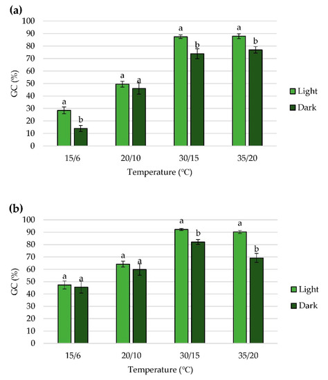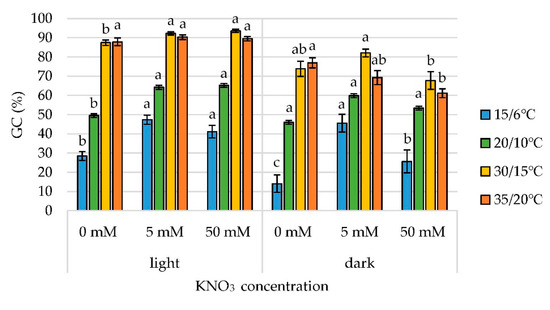 Figure 2 shows that a significant increase in GC was caused by both KNO3 treatments compared to control in light at all temperature regimes except for 35/20 °C, where the increase was not significant. The 5 mM KNO3 treatment also had a positive effect on GC increase in the dark, except at a temperature of 35/20 °C, where GC was lower, but without statistical significance (p > 0.05). Treatment with 50 mM KNO3 increased the GC compared to control (p < 0.05) at all temperature regimes, except at 35/20 °C in light conditions (Figure 2). In dark conditions, GC increased only at 15/6 °C. The 50 mM KNO3 treatment did not have a statistically significant effect on GC compared to control at 20/10 °C and 30/15 °C in dark. Furthermore, GC was significantly lower at 35/20 °C compared to control.