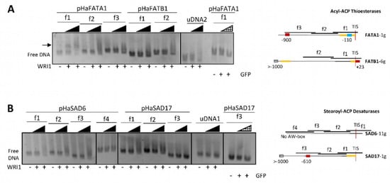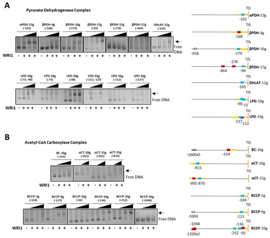 WRI1 binding in agarose EMSA to the sunflower promoter region of genes involved in plastidial fatty acid biosynthesis belonging to pyruvate dehydrogenase (A) and acetyl–CoA carboxylase (B) complexes. The arrow shows the DNA shift due to WRI1 binding: WRI1, 6–His–TRX–WRI1_DBD fusion protein (