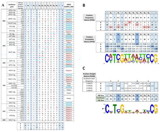 Sunflower AW box sequences present in genes involved in plastidial fatty acid synthesis. (A) All of the sunflower AW box motifs (CNTNG(N)7CG) analyzed by EMSA for binding to the sunflower WRINKLED1 DNA binding domain (HaWRI1_DBD). The sunflower gene names, according to the functional acronym and chromosome location, and the AW box position relative to the ATG codon (TIS: Translational Initiation Site) are shown on the left. EMSA binding of WRI1 to each sequence is shown on the right and the “forbidden” bases are in red. (B) The position frequency and probability matrices (PFM, PPM) for sunflower AW boxes that positively bind WRI1 reveal missing bases (red background) and the base bias (blue background) for most N positions of the canonical sequence. The motif derived from the PPM is shown as a WebLogo pattern. (C) The position weight matrix (PWM) gives the sunflower base frequency, and the active sunflower AW box motif is shown as a MEME pattern.