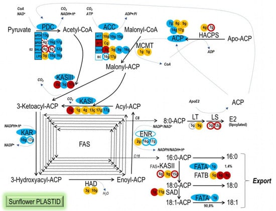 - González-Thuillier, I.; Venegas-Calerón, M.; Garcés, R.; von Wettstein-Knowles, P.; Martínez-Force, E. Sunflower (Helianthus annuus) fatty acid synthase complex: Enoyl-[acyl carrier protein]-reductase genes. Planta 2015, 241, 43–56. [Google Scholar] [CrossRef]