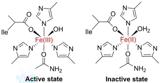 The active and inactive states of LOX. The active state possesses a spin oxidized Fe3+ whereas the inactive state a high-spin Fe2+ (reduced form).
