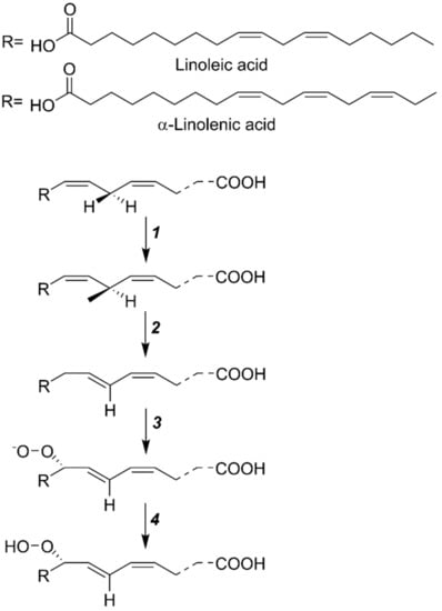 In a wide variety of cells, the metabolic pathway of LOX initiates in plasmalemma and continues to the cytoplasm. In plants, the LOX-mediated reaction incorporates molecular oxygen at the 9 or 13-location of 18-carbon containing polyunsaturated fatty acids (PUFAs). For 9 or 13-LOX, linoleic acid (18:2) and α-linolenic acid (18:3) are the correct substrates []. First, linoleic acid oxygenates the LOX to produce a complex, followed by the biosynthesis of a double-free activator, viz., a hydrogen ion, and the electric ion transfer to an oxygen molecule from linoleic acid at the enzyme surface. The double-free radicals unite to make linoleic acid-hydrogen peroxide, followed by the liberation of H2O2 from the enzyme surface. Previous studies suggest that the plant-extracted LOX shows the highest activity towards linoleic acid and acts in a multistep manner (Figure 2), i.e., (1) according to the free radical theory, hydrogen atoms departure from the substrate and reduction in iron ions occur at the same time; (2) the reaction of molecular oxygen with substrate-free radicals is followed by the production of peroxide-free radicals; (3) the conversion of oxygen into the oxygen-free radicals; (4) at the climax, reduction in peroxide-free radicals by Fe2+ in LOX to produce H2O2, and subsequent oxidation of Fe3+, helps in the formation of active-LOX []. It is assumed that the hydrogen atoms are moved from linoleic acid to iron ions, protons, and simultaneously transferred an electron between the donor and the acceptor, hence creating an efficient hydrogen tunneling effect. It is concluded that the catalytic unit of LOX is closely related to the Fe ions. LOX shows lower activity towards methyl linoleate, linolenic acid, and arachidonic acid, while it shows no activity against oleic acid [,,].