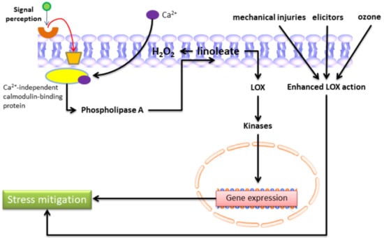 Several defense-related mechanisms participate in developing plant responses against both biotic and abiotic stresses. Signaling organization, triggering the production of anti-stress compounds and their activation, depends on pathogens and patterns of abiotic stress. Signaling molecules such as JA, MeJA, abscisic acid (ABA), ET, SA, and other metabolites may work either alone or interact with each other in either an antagonistic or synergistic manner []. They are organically caught up in a diverse signaling web, which permits plants to pertain to more appropriate defense tactics against abiotic and biotic stresses []. Various investigations have exposed that the action of LOX enhances mechanical injuries [], ozone effects [], elicitors [], and hyperthermia [].