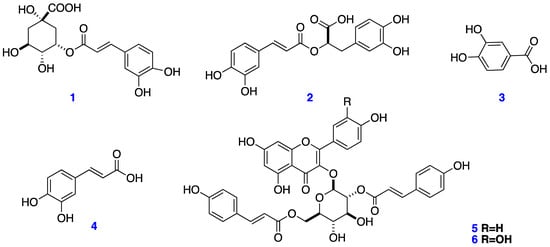 Compounds isolated from Eryngium cymosum. Chlorogenic acid (1); rosmarinic acid (2); protocatechuic acid (3); caffeic acid (4); kaempferol-3-O-(2,6-di-O-trans-ρ-coumaryl)-β-d-glucopyranoside (5); and quercetin-3-O-(2,6-di-O-trans-ρ-coumaryl)-β-d-glucopyranoside (6).