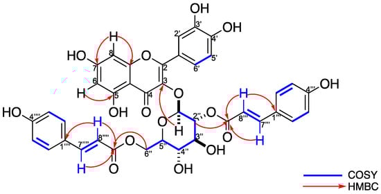 Thereby, the sugar of compound 6 was confirmed as β-D-glucopyranose. Furthermore, in 1H- NMR (Figure S4), four double signals are observed at δH 7.73 (J = 15.9 Hz), 6.44 (J = 15.9 Hz), 7.42 (J = 15.9 Hz), and 6.10 (J = 15.9 Hz) with a characteristic coupling constant of trans-olefinic protons and the COSY correlation are of the protons that resonate at δH 7.73–6.44 and 7.42–6.10 (Figure 2 and Figure S5). Furthermore, in the 1H-NMR spectrum, two AA′BB′ systems are observed, corresponding to the doublets observed at δH 7.50 (J = 8.7 Hz, H-2‴, H-6‴) and 6.83 (J = 8.6 Hz, H-3‴, H-5‴) for the first system, and 7.33 (J = 8.6 Hz, H-2⁗, H-6⁗) with 6.83 (J = 8.6 Hz, H-3⁗, H-5⁗) for the second system (Figure S4). These protons correspond to the strong carbon signals seen at δC 131.2 and 116.8 for the first system, and δC 131.3 and 116.8 for the second AA′BB′ system (Figure S6). Furthermore, in the 13C-NMR (Figure S8), two carbonyls are observed that resonate at δC 168.6 and 168.8, which, according to the HMBC experiment (Figure 2 and Figure S7), correlate with the protons that resonate at δH 7.73 and 6.44 for the carbonyl that resonates at δC 168.6, and δH 7.42 and 6.10 for the carbonyl that resonates at δC 168.8. This indicates the presence of two cinnamic moieties. According to the HMBC experiment (Figure 2 and Figure S7), a cinnamic molecule is in position 2 of the sugar, since a correlation of the carbonyl that resonates at δc 168.6 with the H-2″ (5.13, dd, J = 9.5, 8.0 Hz) of the sugar. The other cinnamic molecule present in compound 6 is bound, according to the HMBC experiment, to the C-6″ (δC 64.2) of the sugar, observing a correlation of the carbonyl group that resonates at δC 168.7 with the H-6a″ (4.38, dd, J = 11.7, 2.2 Hz) and H-6b″ (4.22, dd, J = 11.8, 6.8 Hz) protons (Figure 2 and Figure S7). The 1H- and 13C-NMR data (Table 1) were in complete agreement with the proposed structure and compound 6 was established as quercetin-3-O-(2,6-di-O-trans-ρ-coumaryl)-β-d-glucopyranoside (Figure 2).