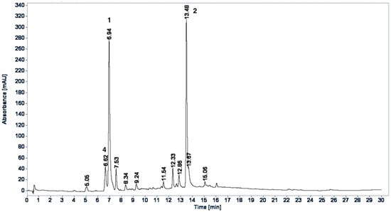 HPLC-DAD profile butanol extract of E. cymosum; acquisition of λ 320 nm. Phenomenex® Kinetex C18 (Phenomenex Inc., Torrance, CA, USA) 100 Å (50 × 2.1 mm id., 5 μm) reversed-phase column; the column temperature was kept at 35 °C; the flow rate was 0.35 mL/min; elution was carried out with water containing 0.1% (v/v) formic acid and acetonitrile (MeCN), as described in the experimental section.