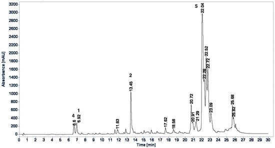 HPLC-DAD profile of water extract of E. cymosum; acquisition of λ 320 nm. Phenomenex® Kinetex C18 (Phenomenex Inc., Torrance, CA, USA) 100 Å (50 × 2.1 mm id., 5 μm) reversed-phase column; the column temperature was kept at 35 °C; the flow rate was 0.35 mL/min; elution was carried out with water containing 0.1% (v/v) formic acid and acetonitrile (MeCN), as described in the experimental section.