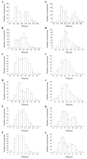 Frequency distribution of plant height and its component traits in the natural population in 2018 (A–F) and in 2019 (G–L). PH, plant height; PL, panicle length; 1IN, first internode from the top; 2IN, second internode from the top; 3IN, third internode from the top; and 4IN, fourth internode from the top.