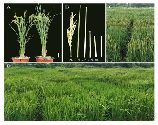 The use of semi-dwarf rice cultivars solves the problem of increasing fertilizer application without lodging before harvest, so as to increase yield (compared with high stalk cultivars) [5,6]. The use of hybrid rice cultivars can increase yield (compared with semi dwarf conventional cultivars) by using heterosis and appropriately increasing total biomass [7,8]. However, in order to further improve the grain yield per unit area of hybrid rice varieties, it is necessary to manipulate the length of each internode in the aboveground part of rice plants, so as to make the field plant population develop to the upper space, and not only increase the biomass per unit area, but also not lead to lodging before harvest. This plant height design is also necessary for development of the parents of hybrid rice cultivars (male sterile line, maintainer line, restorer line and photo-thermosensitive genic male sterile line) and conventional cultivars.