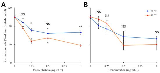 The germination rate of Brassica napus seeds, treated using needle extracts of P. densiflora and P. koraiensis, is shown in Figure 1. As shown, the germination rate rapidly decreased to 71 and 48% of the control with 0.25 mg mL−1 extract of the P. densiflora needle dried at 30 and 90 °C, respectively (Figure 1A). Reduction of the germination rate hardly occurred despite the concentration increase. In contrast, with P. koraiensis, the germination rate continually decreased to 57 and 38% of control after using 0.5 mg mL−1 extract of the needle dried at 30 and 90 °C, respectively.