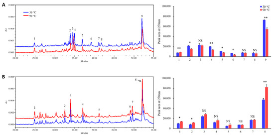 HPLC chromatograms and peak areas detected at 278 nm of separated compounds in needle extracts of Pinus densiflora (A) and P. koraiensis (B) dried at 30 or 90 °C. Asterisks indicate significant difference between dry temperatures on Tukey’s HSD test followed by * (p < 0.05) and ** (p < 0.01). NS indicates no significant difference.