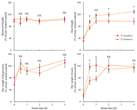 Changes of growth rates of Brassica napus seedlings depending on steam time of Pinus densiflora and P. koraiensis needles. Asterisks indicate significant difference on Tukey’s HSD test followed by * (p < 0.05). NS indicates no significant difference.