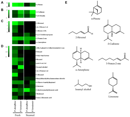 Heatmap describing relative contents of major (A); semi−major (B); semi−minor (C); and minor (D); volatiles and allelopathic volatile compounds (E) in either fresh or steamed needles of Pinus densiflora and P. koraiensis.