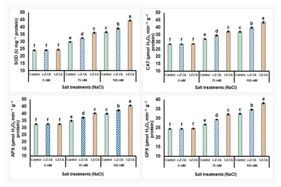 Seed pretreatment using 50 µM c-Z-Ck or 40 µM t-Z-Ck did not affect the enzymatic antioxidant activities of maize (Giza-168) compared to the control (Figure 2). Exposing maize plants to salt stress with 75 mM NaCl increased the enzymatic antioxidant activities by 19.1%, 10.9%, 6.9%, and 8.6%, respectively, for SOD, CAT, APX, and GPX compared to the control. Further, exposing maize plants to salt stress with 150 mM NaCl further increased the enzymatic antioxidant activities by 34.0%, 22.7%, 15.6%, and 24.6%, respectively, for SOD, CAT, APX, and GPX compared to the control. However, pretreatment with c-Z-Ck and t-Z-Ck mitigated the 75 and 150 mM NaCl stress impacts and significantly elevated SOD, CAT, APX, and GPX activities compared to the stressed 75 and 150 mM NaCl controls. Seed treatment with t-Z-Ck exceeded c-Z-Ck under both stress concentrations (75 and 150 mM NaCl), which exceeded the stressed control by 17.7% and 18.0% for SOD, 13.7% and 14.7% for CAT, 13.4% and 12.9% for APX, and 16.8% and 14.7% for GPX activity, respectively, under the stress conditions of 75 and 150 mM NaCl. The seed treatment was more effective under stress than under normal conditions (Figure 2).